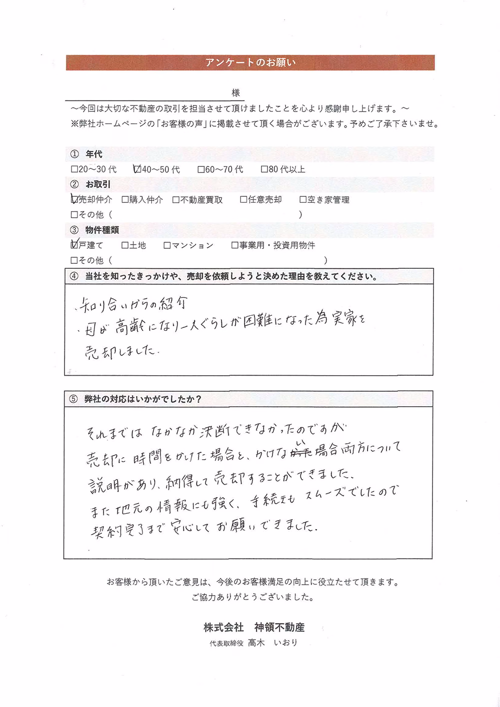 施設で暮らすご高齢のお母様が手術入院なさったとのことで、以前よりご相談いただいていた空き家のご実家をなるべく早く売却して欲しいとの依頼を受け、早急に売却のお手伝いをさせていただきました。