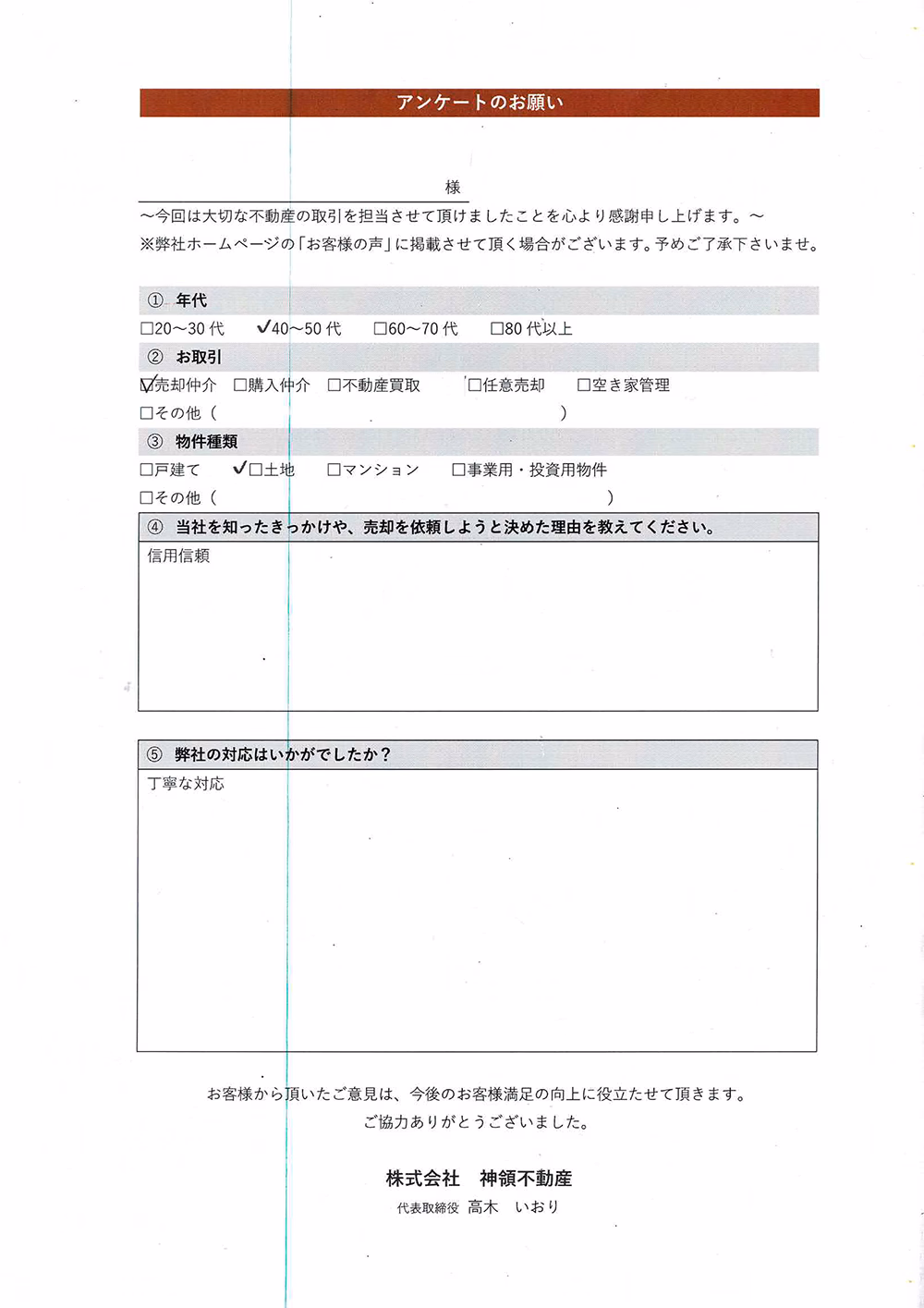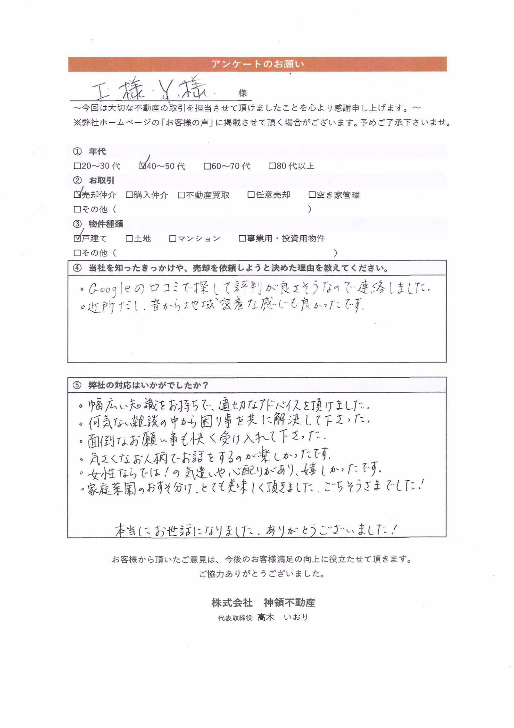 神領不動産がお客様からいただいた声の一部をご紹介します。当社は春日井市で50年の実績があり、地域密着の不動産会社として多くのお客様にご利用いただいています。女性代表が自ら不動産売却の相談に対応しており、女性のお客様からご相談されることも多いです。プライバシーを守り、お客様のご事情に合わせた不動産売却が可能です。